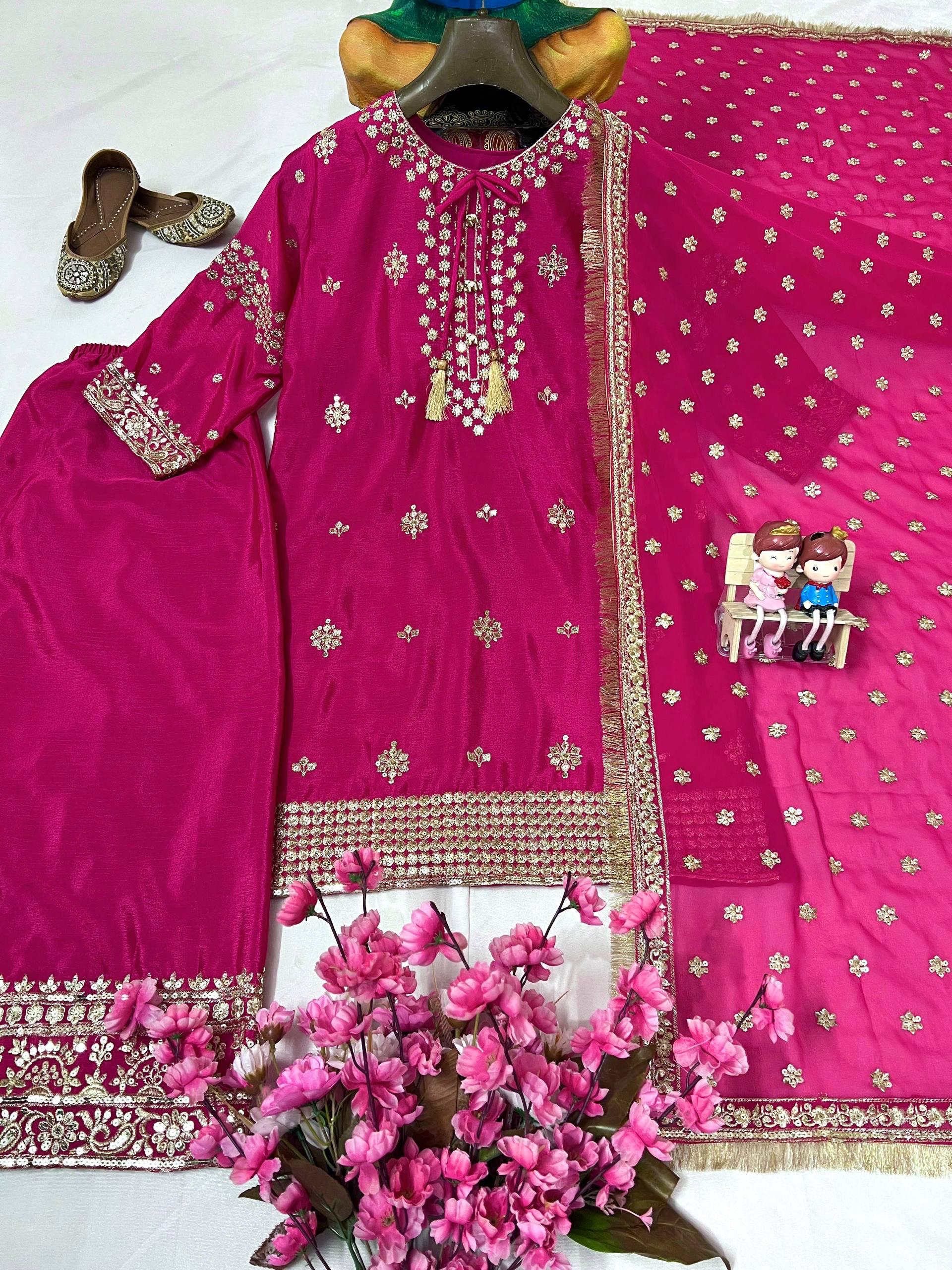 This stunning magenta sharara suit is crafted in luxurious chinon fabric, beautifully highlighted with intricate mirror and zari embroidery. The kurta is paired with a matching sharara finished with heavy golden borders, giving it a regal touch. The look is completed with a georgette dupatta featuring delicate embroidery and sequin work, making it a perfect pick for weddings, festive occasions, and special celebrations.