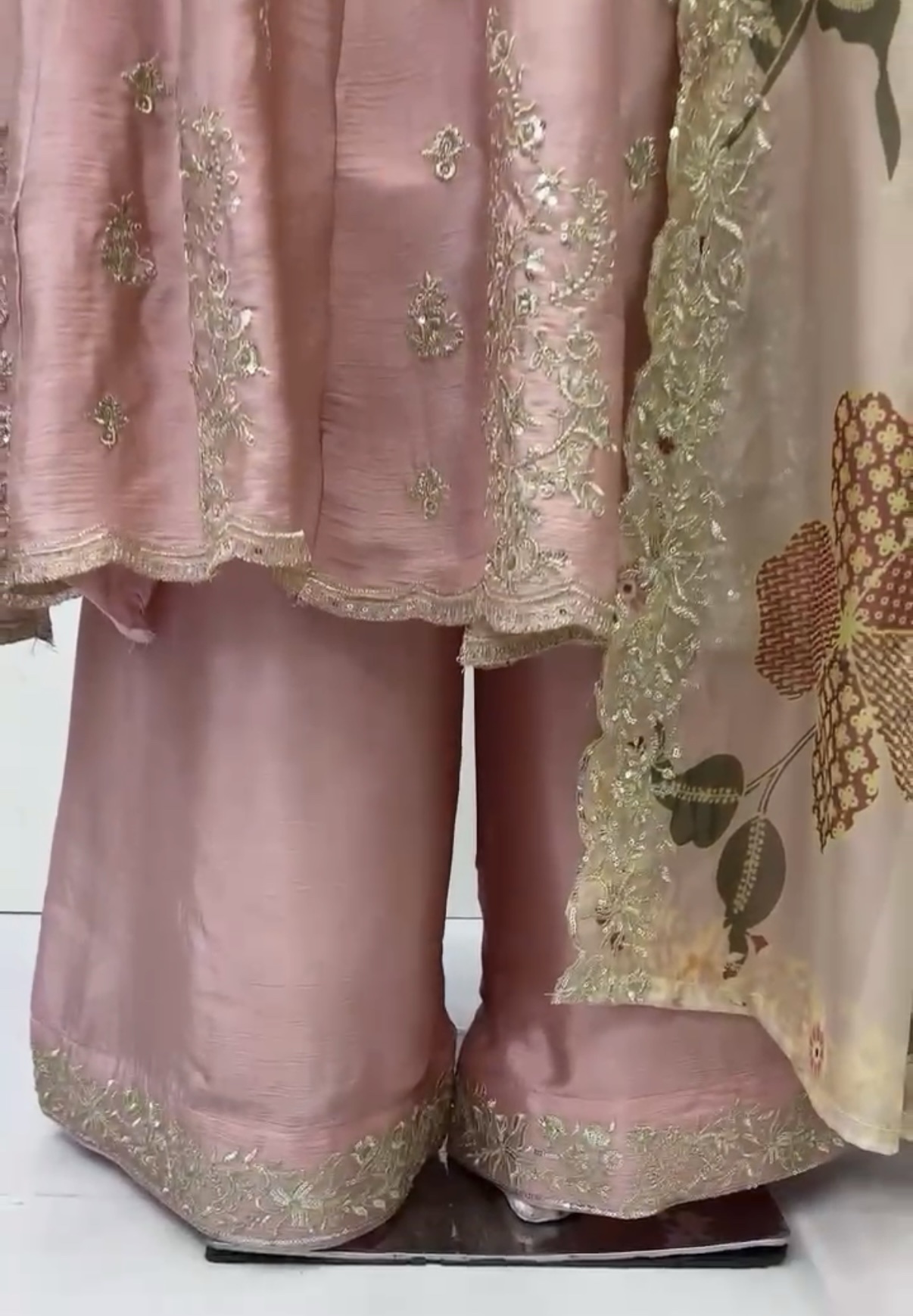 The Anarkali and the matching wide-leg Palazzo pants are subtly yet richly embellished with delicate Zari and Sequence work. This tasteful embroidery, concentrated around the neckline, bodice, hemline, and palazzo borders, adds a sophisticated sparkle without overpowering the soft silk.