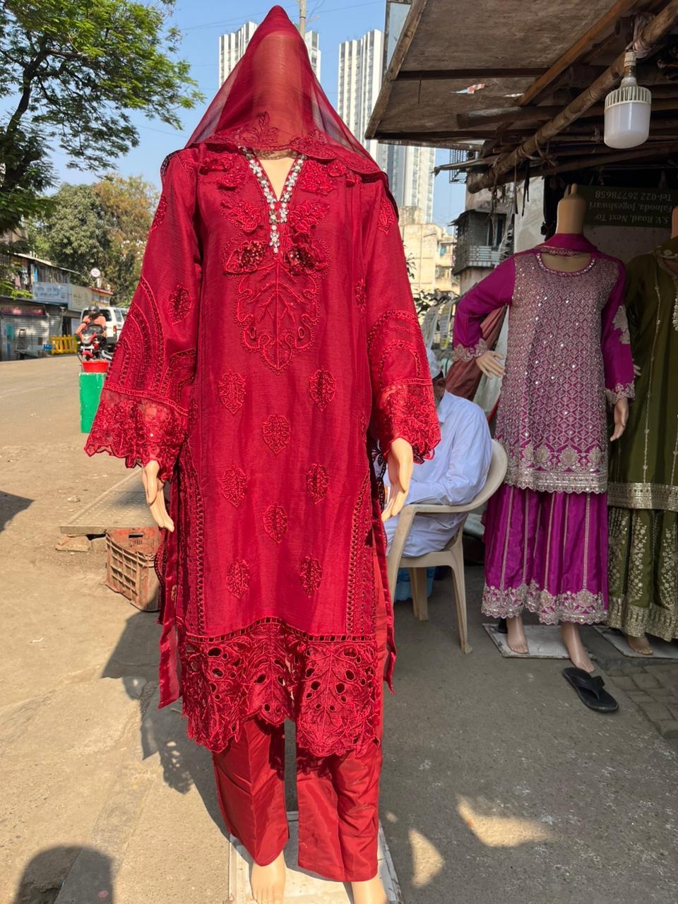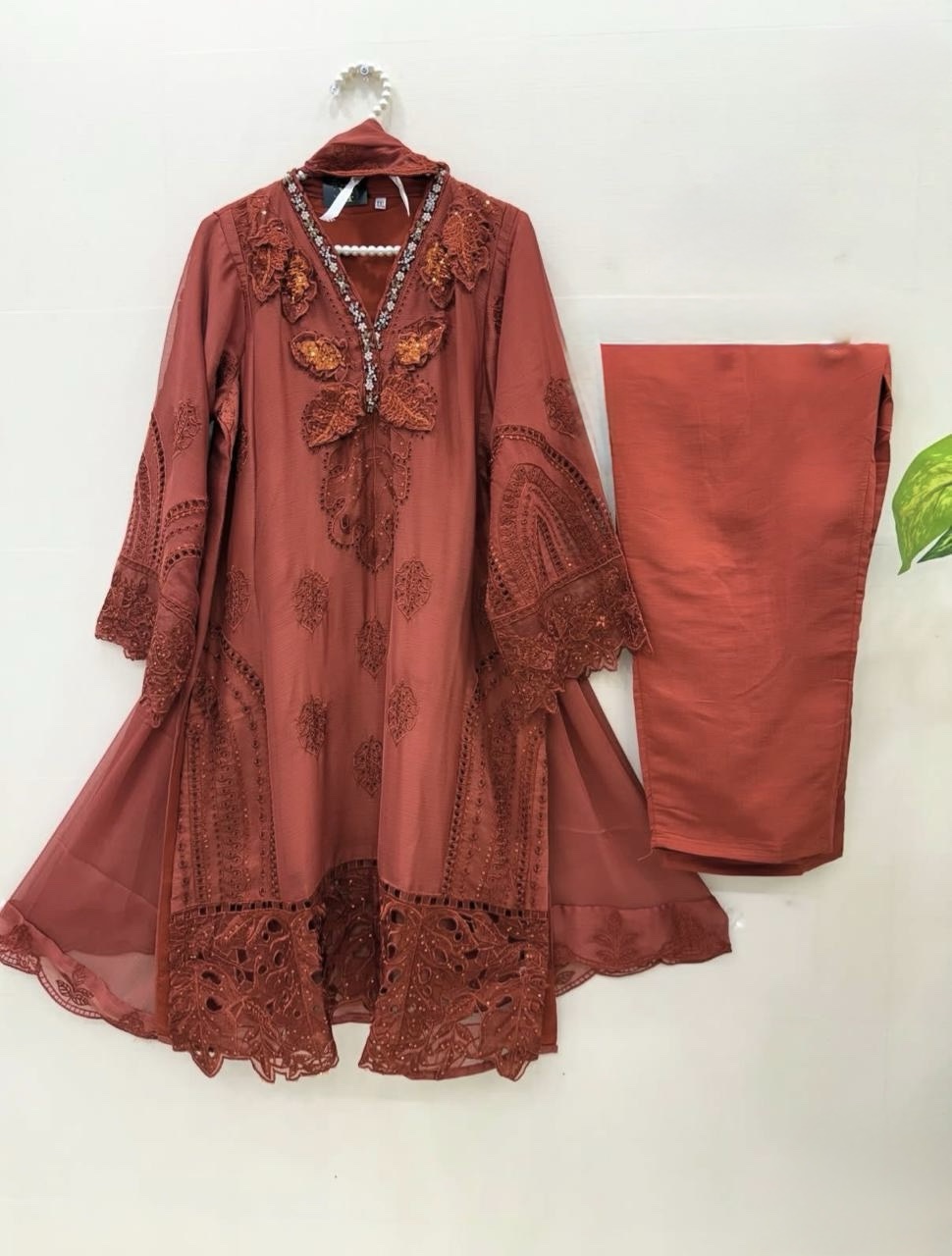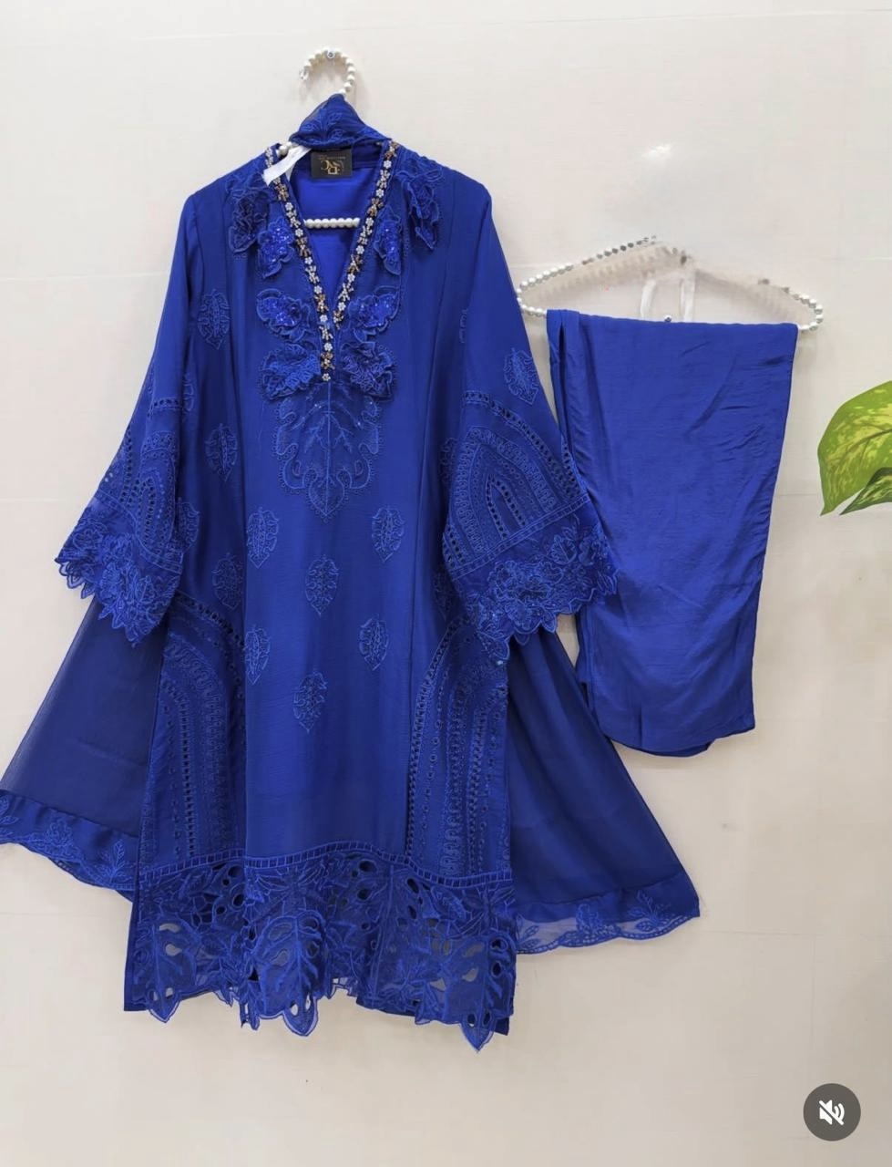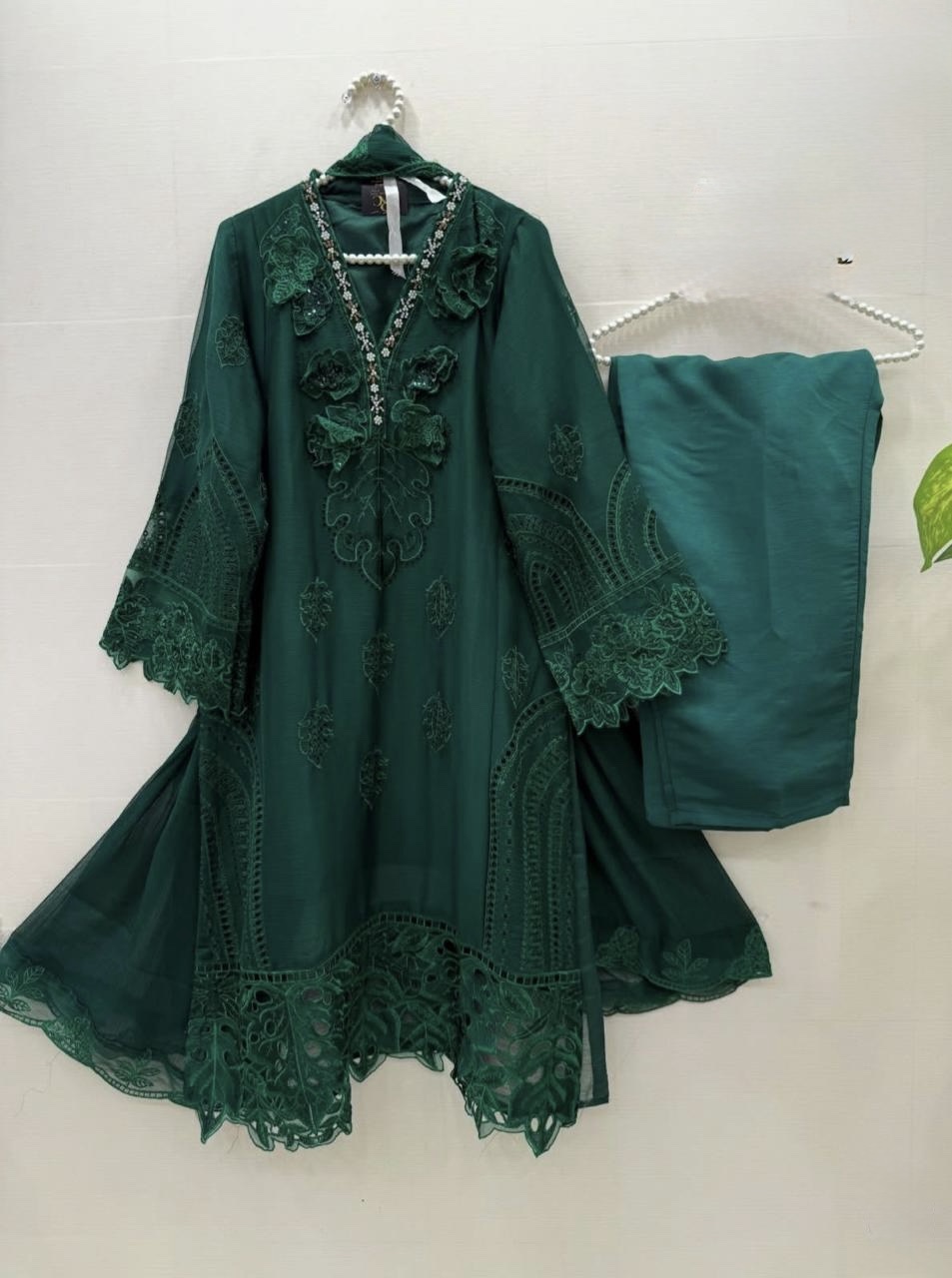 The wide, bell-style sleeves give it a modern, airy feel, while the detailed borders enhance the overall finish of the outfit. Paired with a matching plain bottom, this set keeps the look balanced and refined.