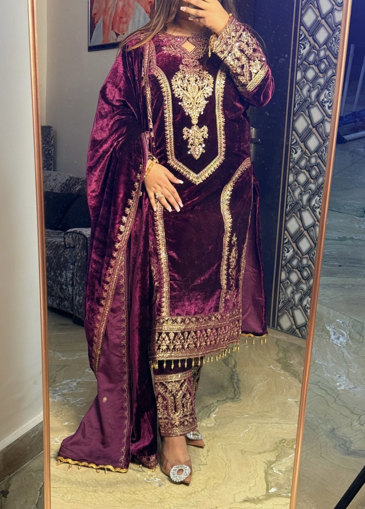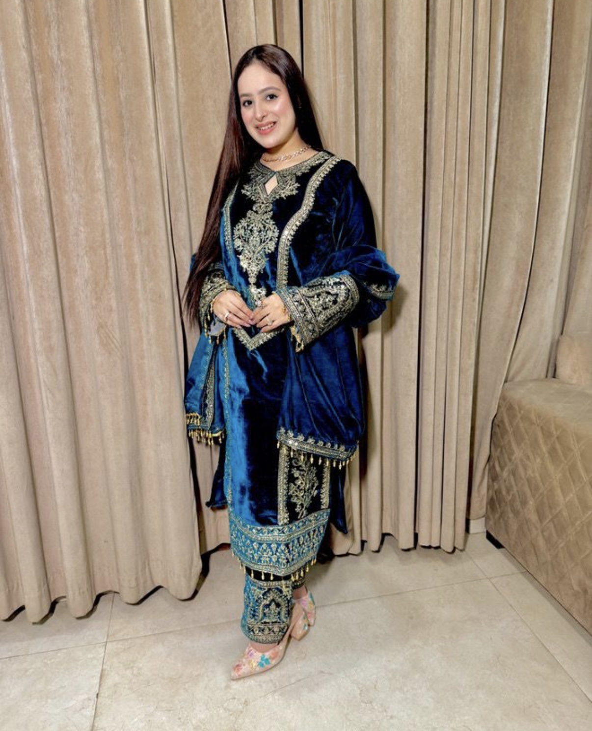 - Velvet Dupatta: A beautifully designed velvet dupatta with exquisite detailing completes the regal look.