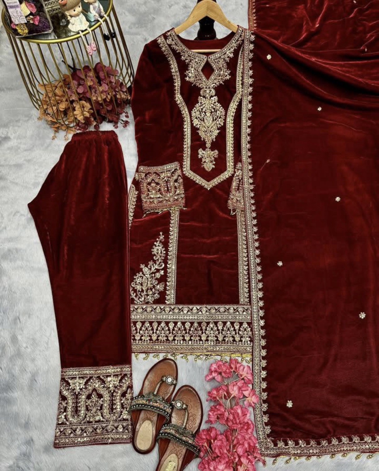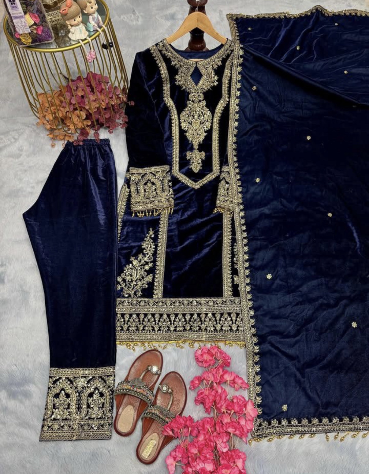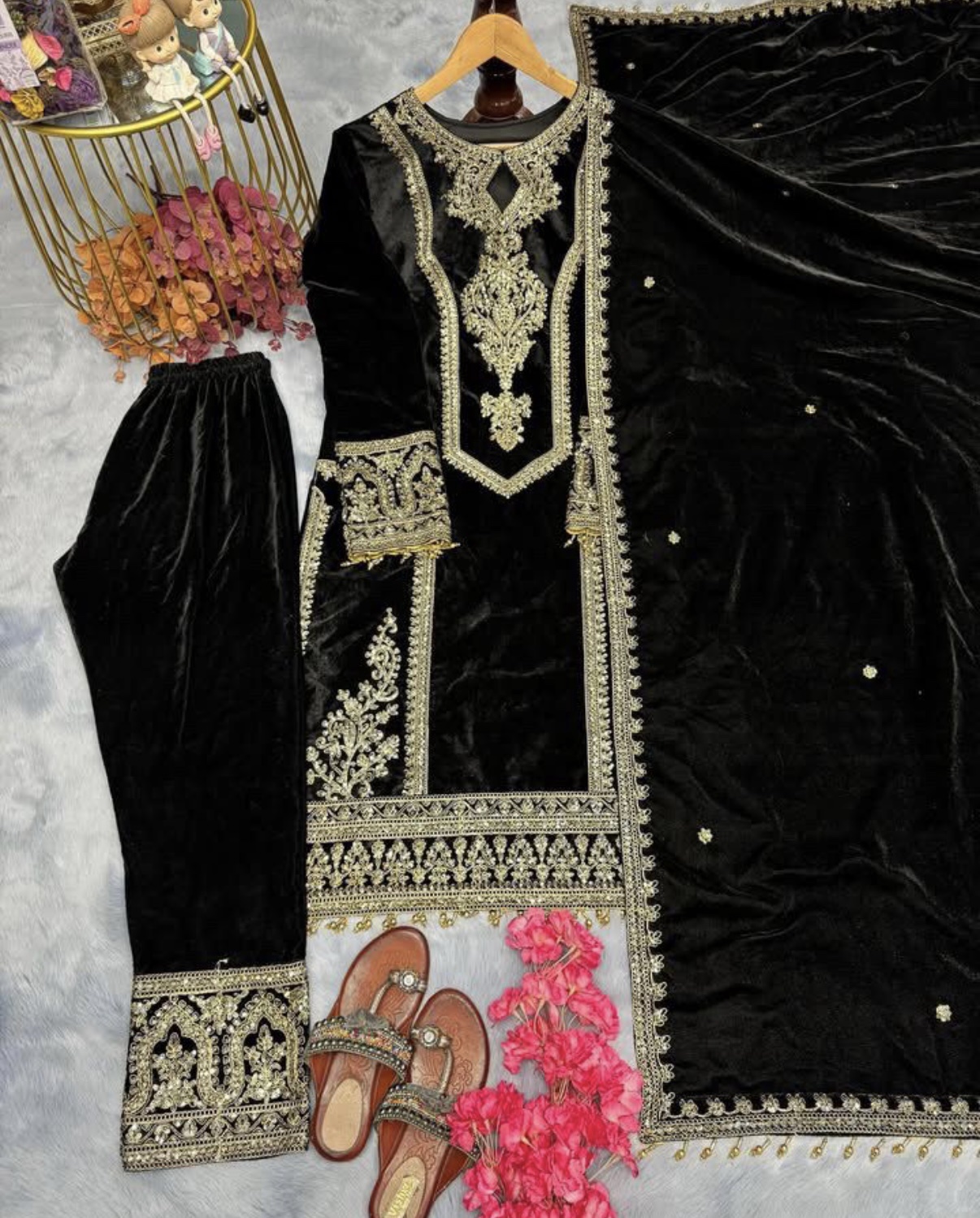 - Velvet Shirt: Crafted from premium velvet fabric, the shirt is adorned with intricate embroidery, exuding timeless charm and grace.