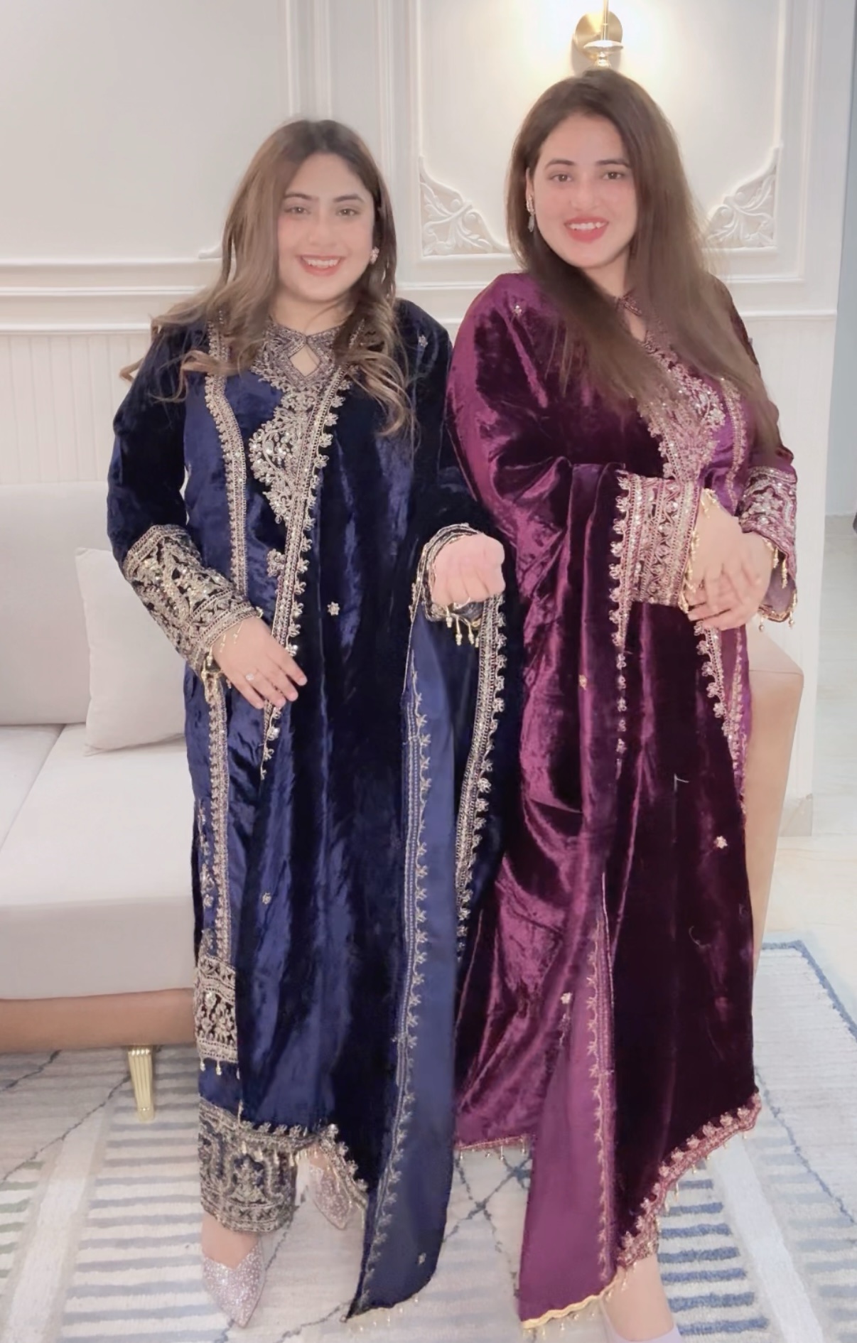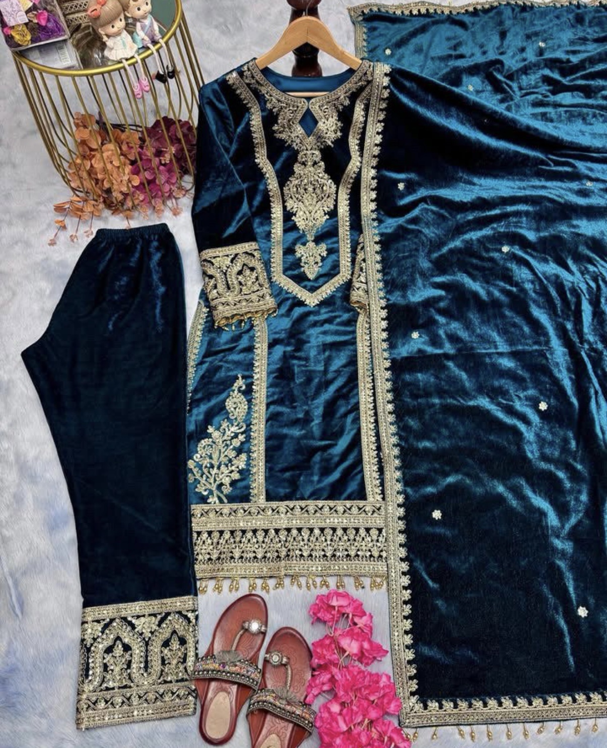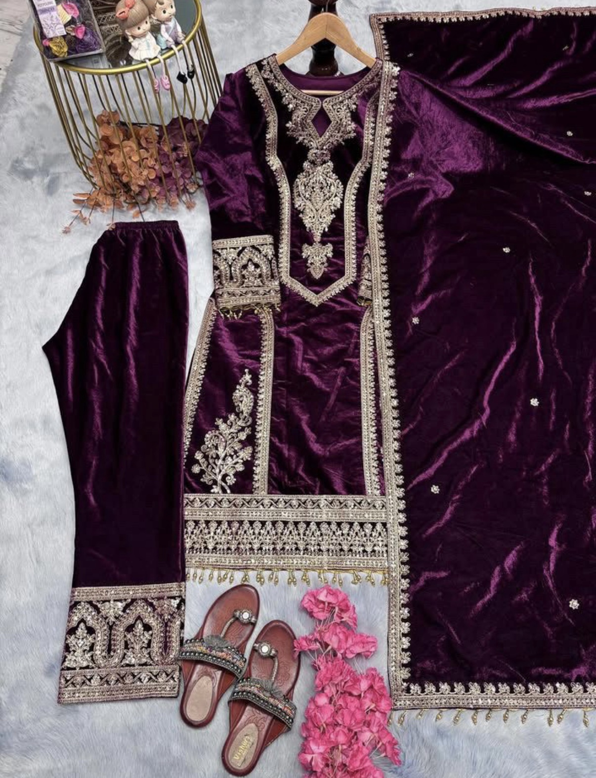 - Velvet Shirt: Crafted from premium velvet fabric, the shirt is adorned with intricate embroidery, exuding timeless charm and grace.