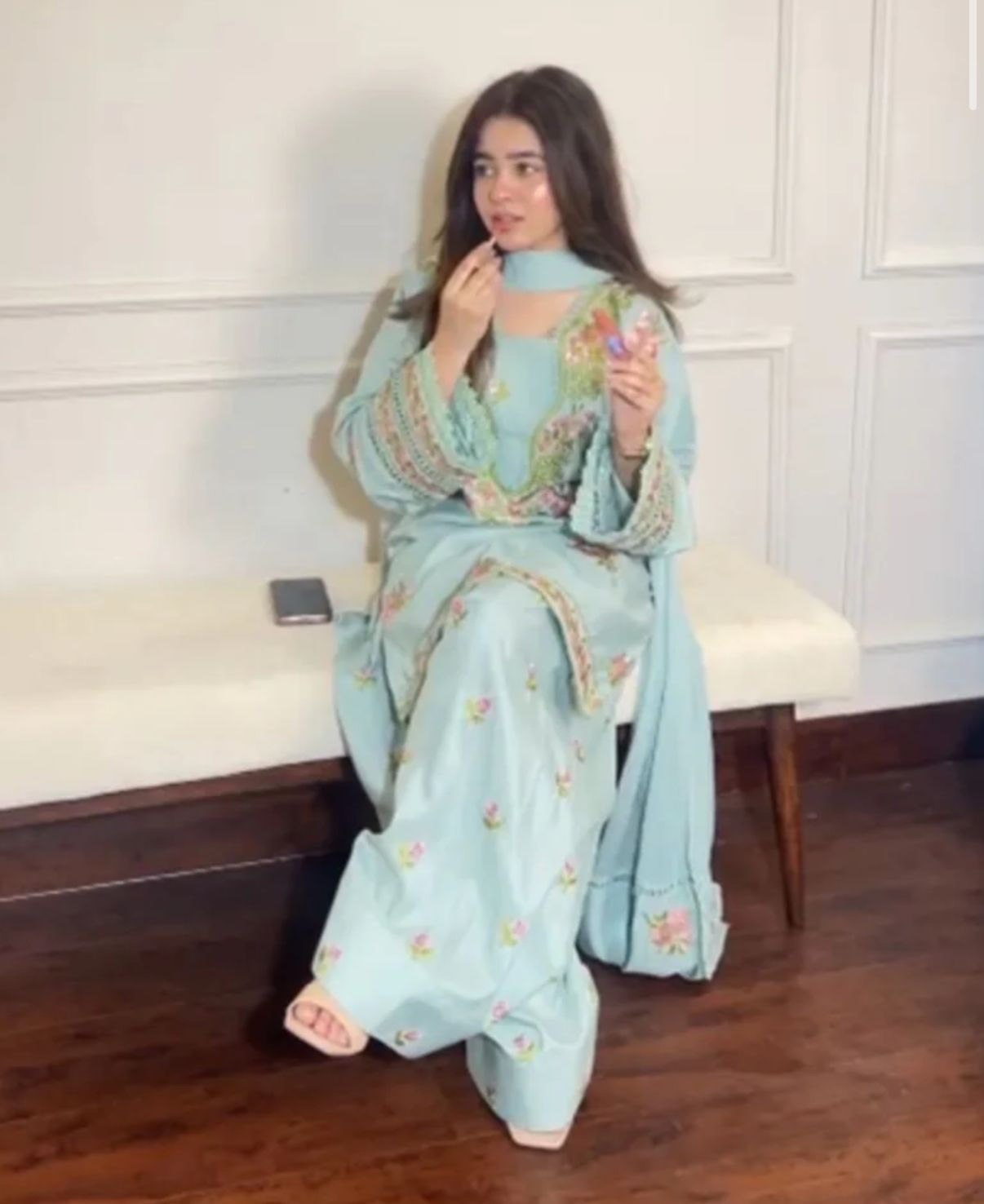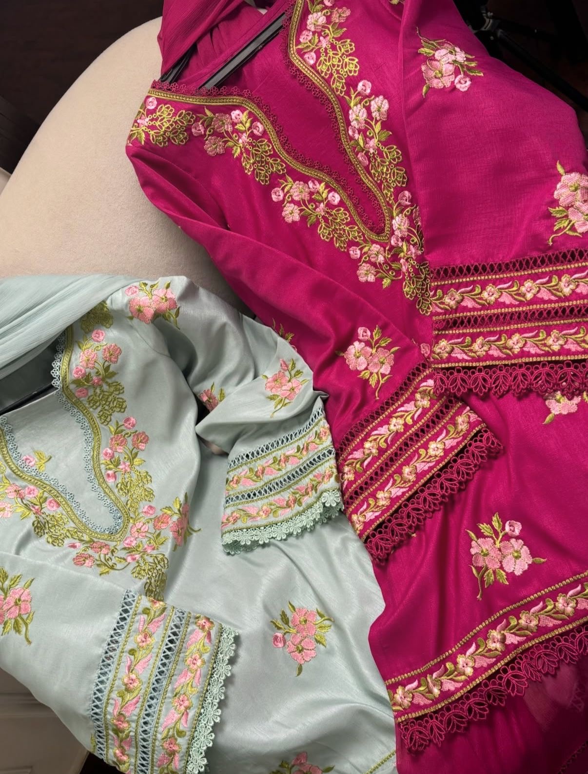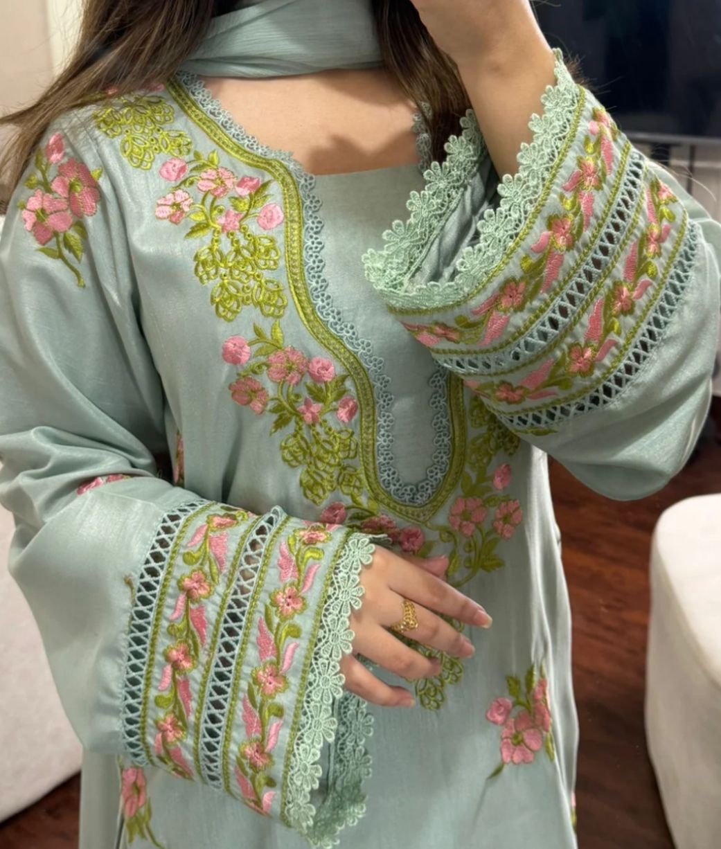 Adorned with intricate embroidery and detailed lace work, the kurta showcases fine craftsmanship that enhances its traditional appeal. The coordinated bottoms and matching dupatta complete the look, making it perfect for festive gatherings, cultural occasions, and elegant daywear.