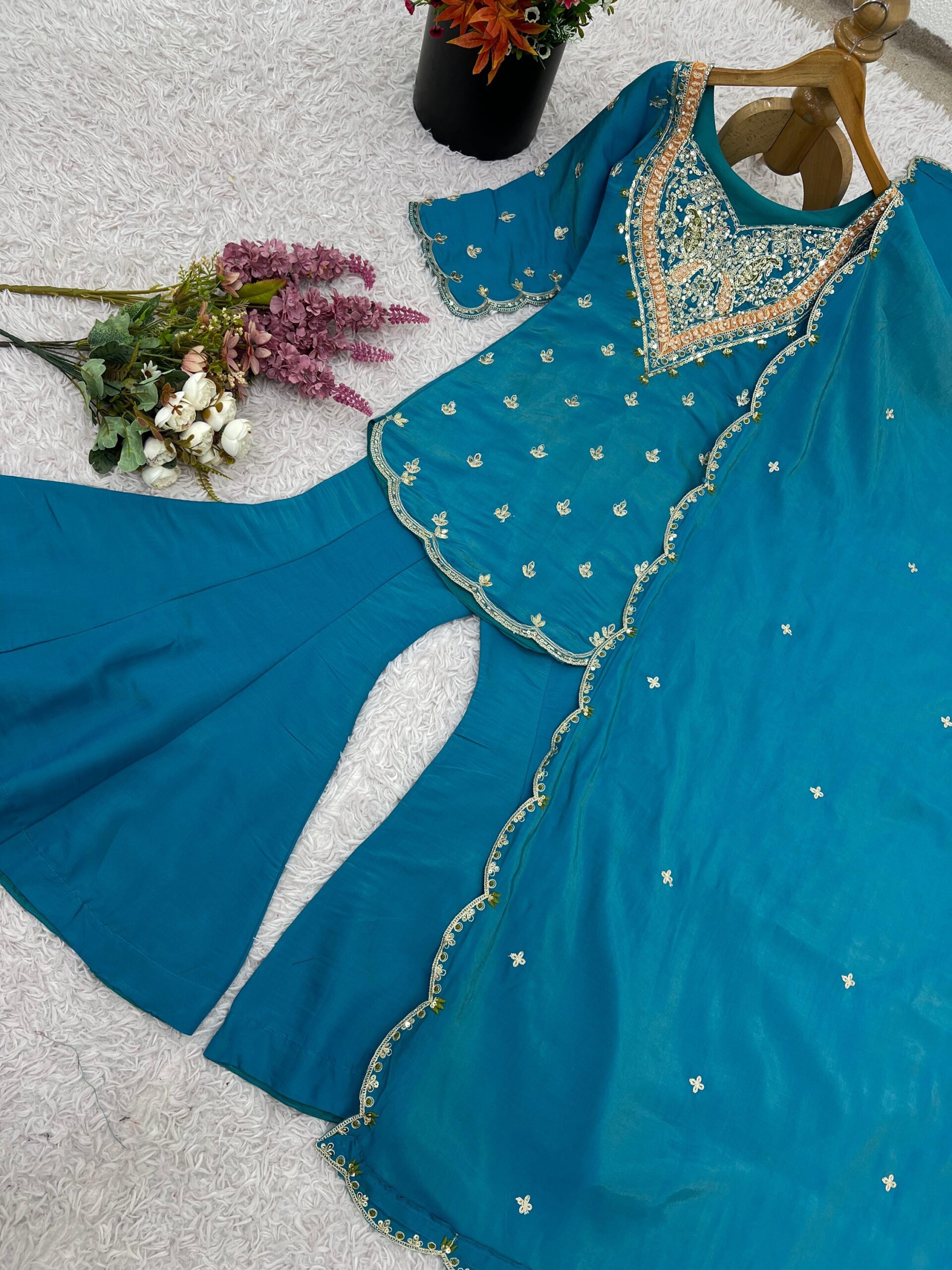 Designed in a graceful hue, this ensemble features a beautifully hand-embroidered kurta with intricate detailing on the neckline, paired with stylish flared pants and a matching dupatta adorned with delicate motifs.