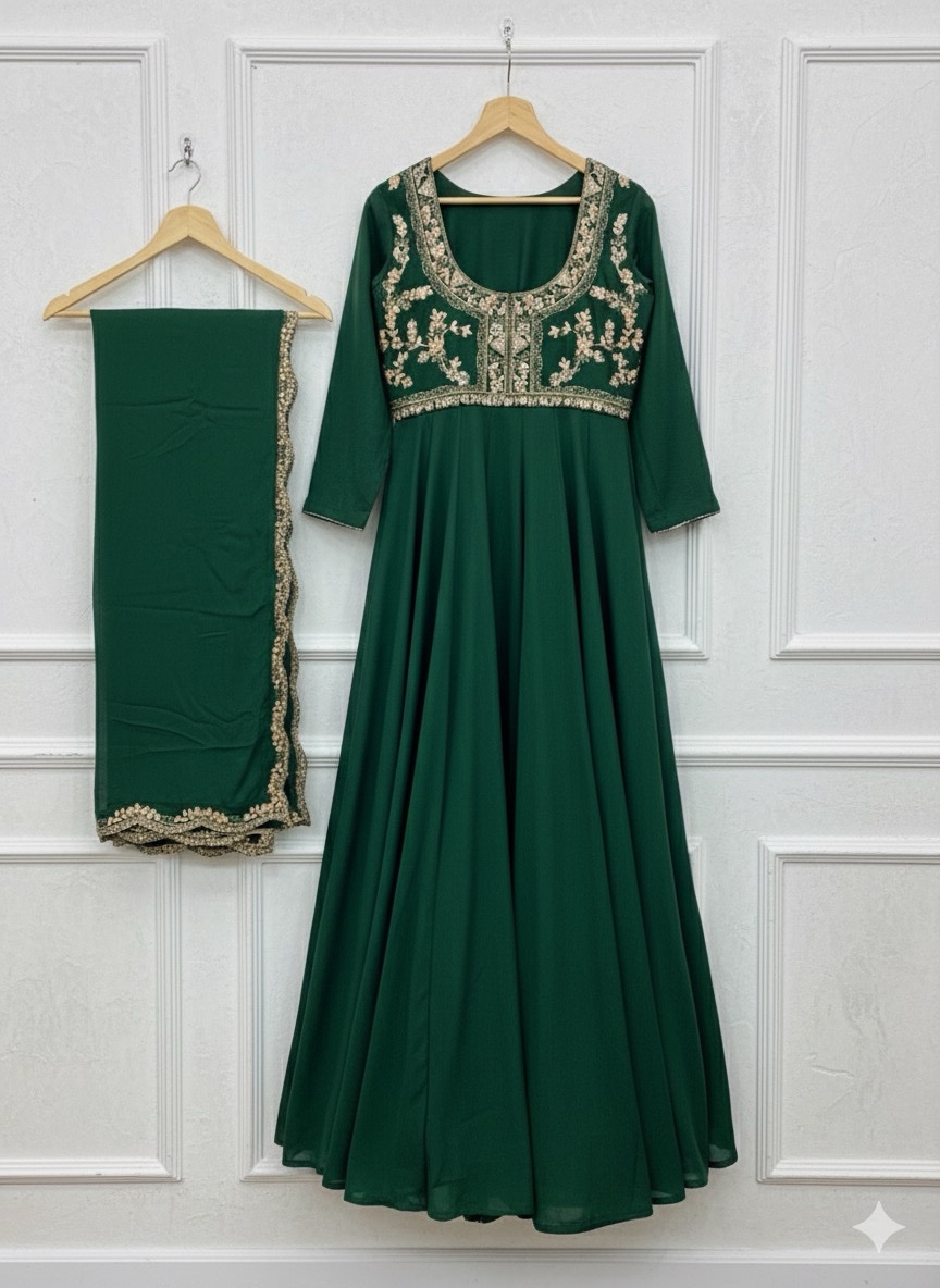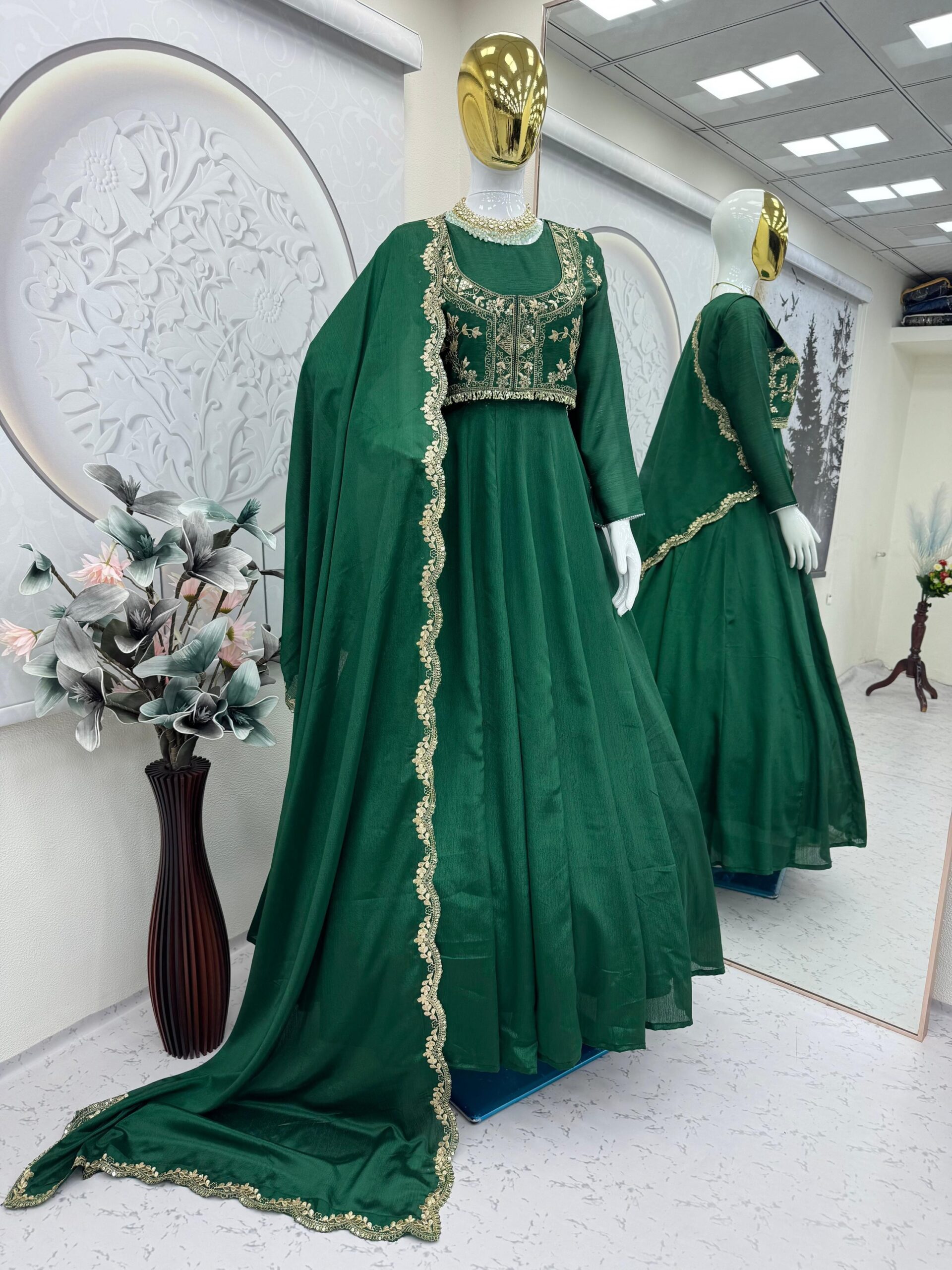 Make a royal statement with this exquisite Anarkali set featuring a stylish jacket and dupatta. Crafted in premium Chinon silk fabric, this outfit is designed to elevate your festive and wedding looks with its luxurious charm.