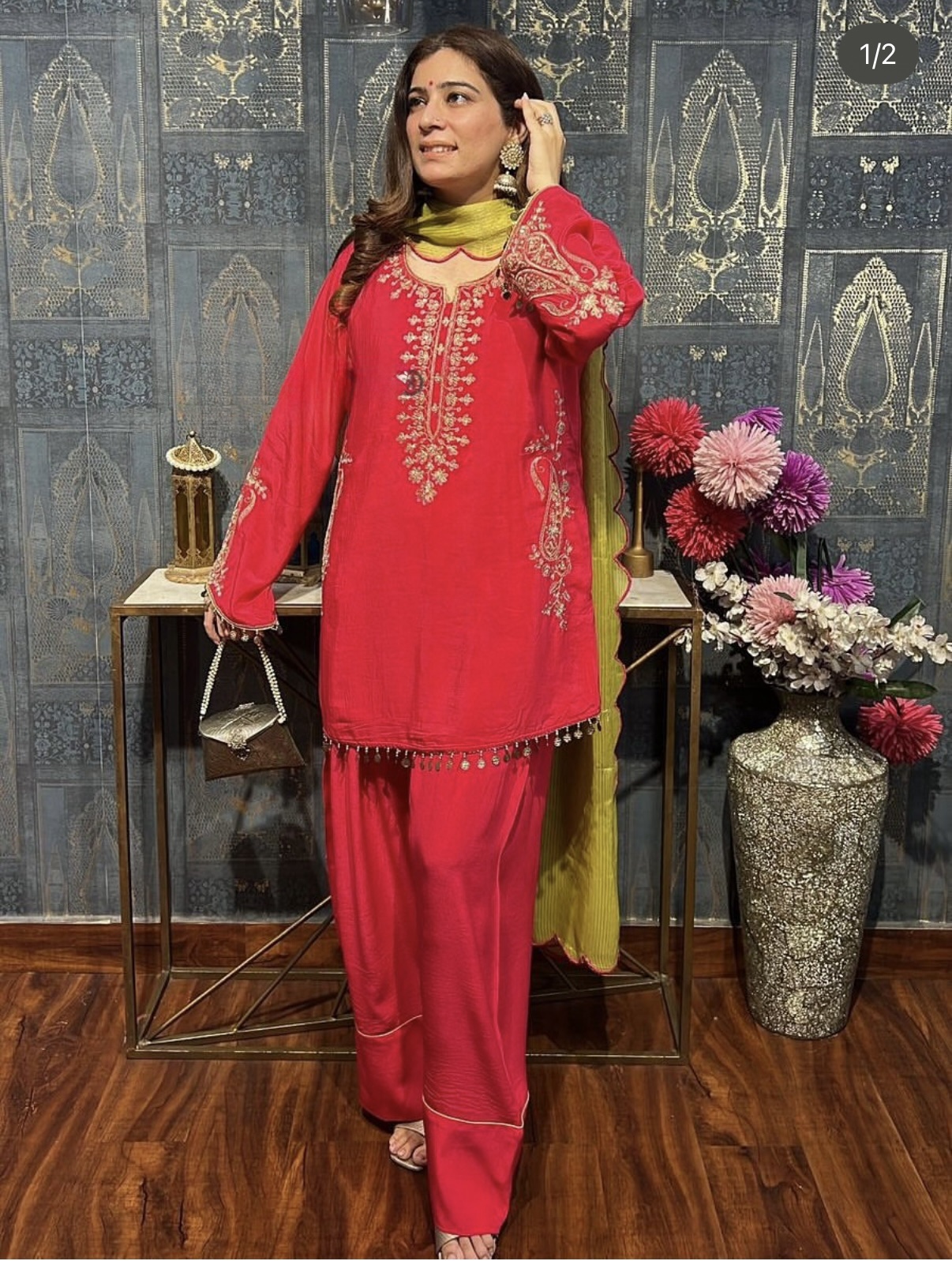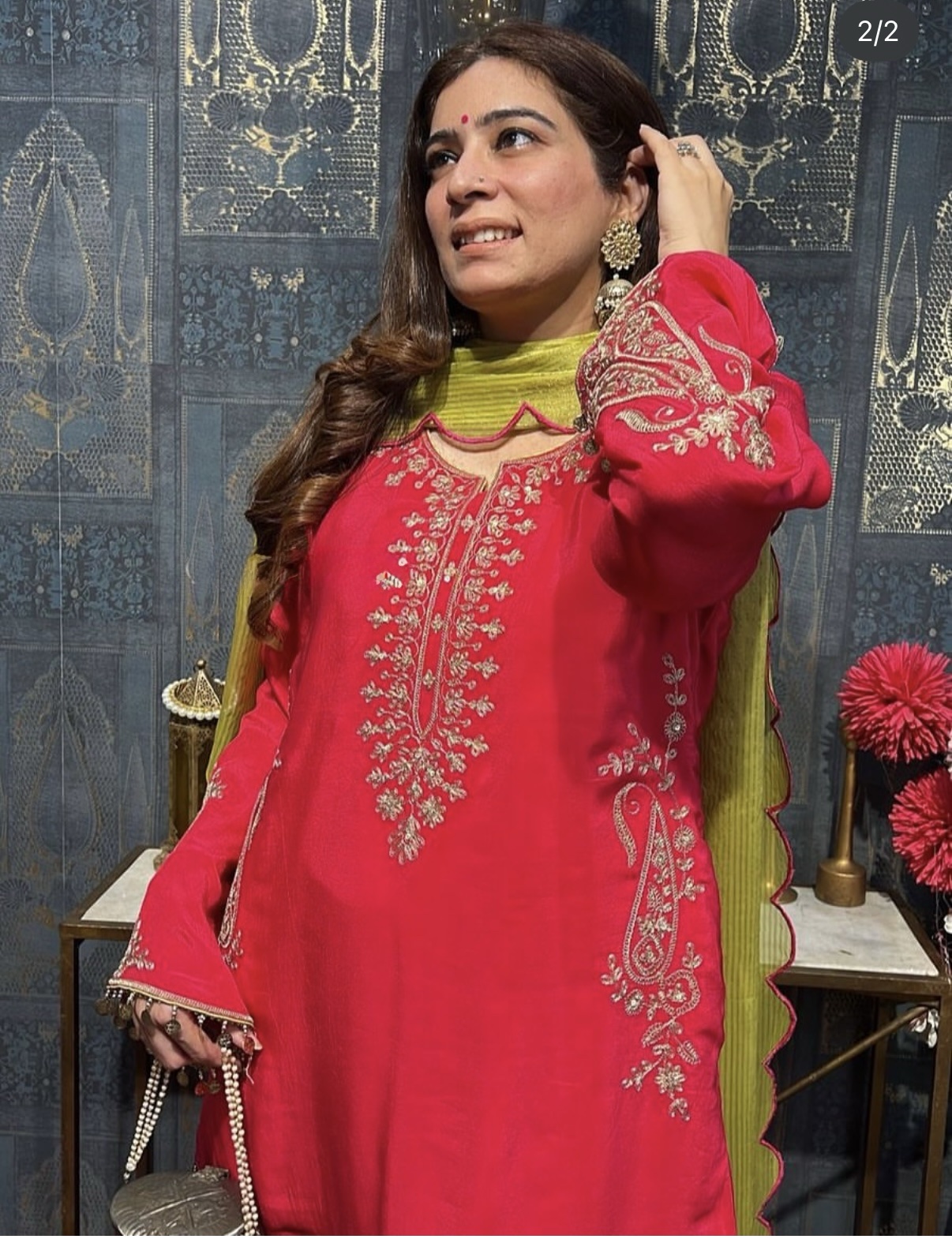 Elevate your festive wardrobe with our Zariya suit, crafted in luxurious crepe fabric and adorned with delicate zari embroidery work. Designed to flatter every size from S to 12XL, this ensemble pairs beautifully with a contrast dupatta, adding a vibrant touch of elegance. Perfect for festivals, weddings, and special occasions, this suit is a blend of tradition and sophistication.